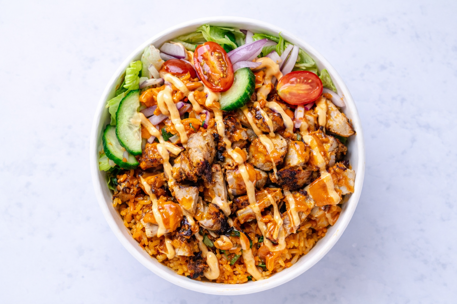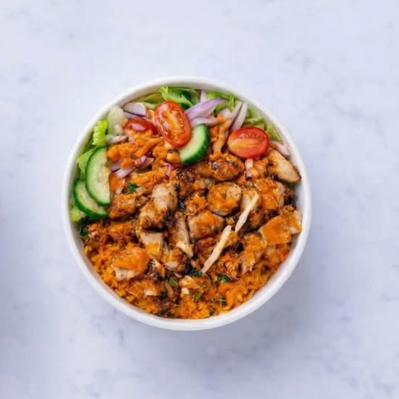 SERVED WITH RICE, MIXED LETTUCE, iceberg lettuce or romaine lettuce, TOMATOES, ONIONS, CUCUMBERS, grated carrots, EMILIA VINAIGRETTE AND SPICY MAYO. CHOICE OF SAUCE: MILD OR SPICY.